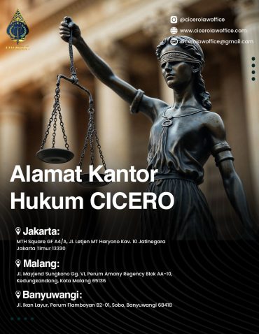 Kantor Hukum CICERO merupakan firma hukum yang telah berpengalaman lebih dari sepuluh tahun dalam memberikan layanan hukum yang profesional di Indonesia. Kantor pusat kami terletak di Jakarta, serta memiliki kantor cabang di Kota Malang dan Banyuwangi.